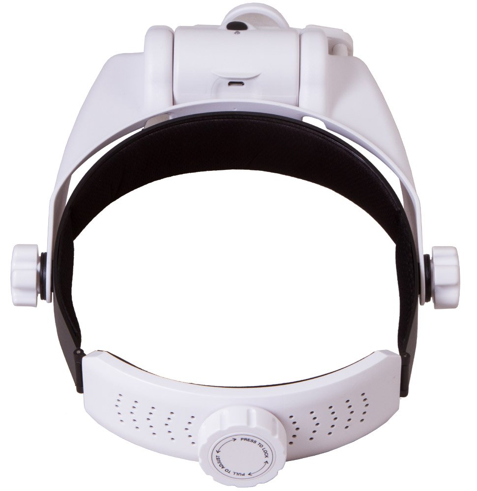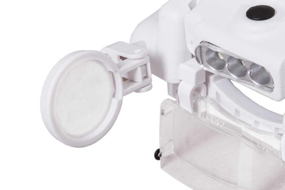 Levenhuk Zeno Vizor HR2 – налобная лупа со светодиодной подсветкой, работающей от аккумулятора. Благодаря комбинируемым линзам увеличение оптики можно отрегулировать в зависимости от задачи. Две линзы установлены прямо в корпус и рассчитаны на все поле зрения, третья предназначена только для правого глаза. При необходимости все линзы можно отвернуть в сторону, чтобы осмотреть рабочую область невооруженным глазом.