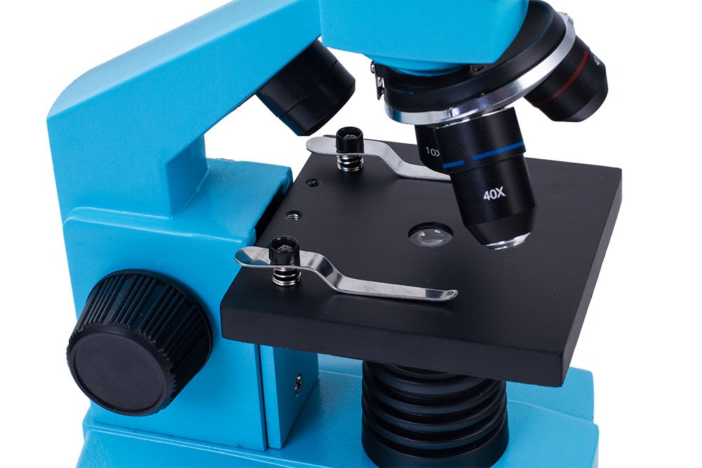 Микроскоп комплектуется тремя объективами 4х, 10х и 40х и широкопольным окуляром WF16х. Предметный столик оснащен зажимами для надежной фиксации препарата.