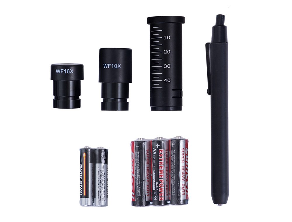 Микроскоп оснащен тремя объективами (4x, 10x, 40x) и двумя широкопольными окулярами (WF10х и WF16х). Кроме того, в комплект входит двукратная линза Барлоу.