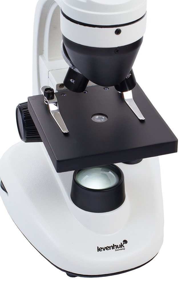 Для освещения микропрепаратов предусмотрены две светодиодные подсветки. Нижняя позволяет изучать прозрачные препараты, а верхняя – непрозрачные объекты. Прибор может работать как от сети, так и от батареек. В комплект входит кейс для хранения и переноски.