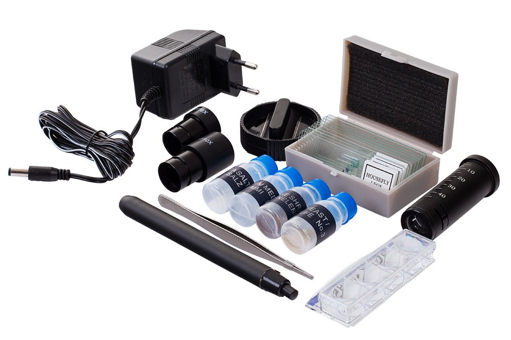 Достоинством данной модели можно назвать и богатую комплектацию. В комплект входит пылезащитный чехол, кейс для хранения и транспортировки, набор готовых микропрепаратов и руководство по использованию микроскопа.