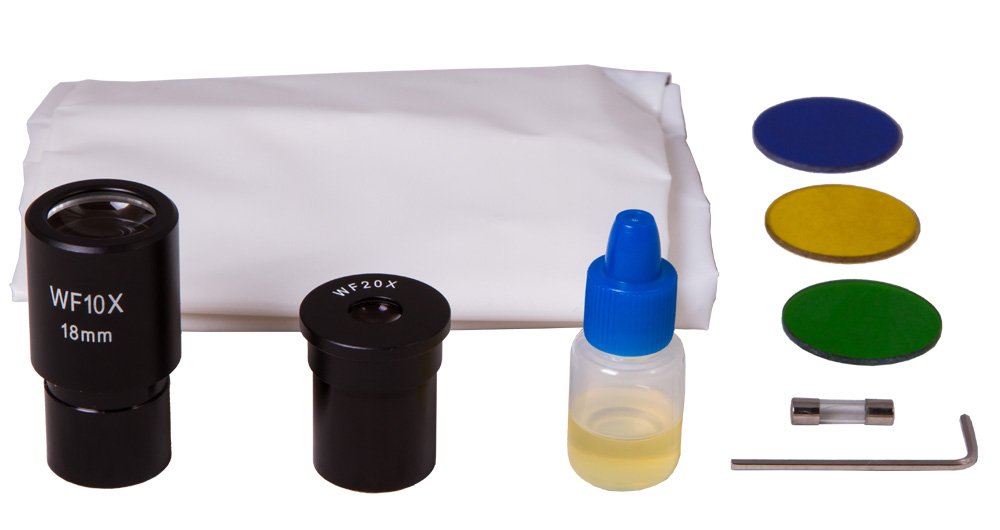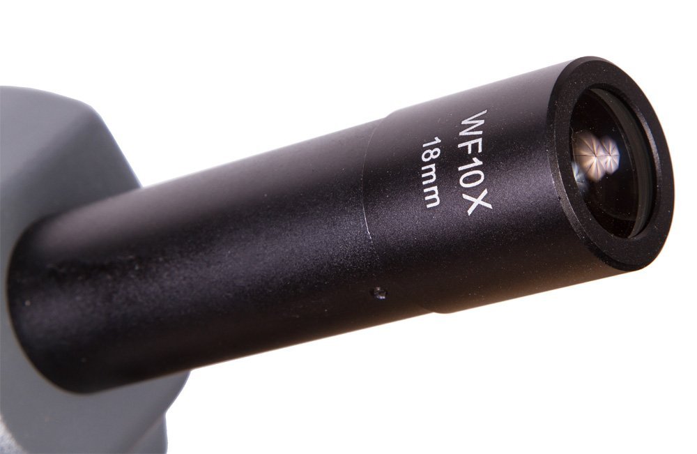 Револьверное устройство рассчитано на 4 объектива. В комплекте идут ахроматические объективы. Объектив максимальной кратности можно использовать для иммерсионного метода наблюдений. В этом случае улучшается яркость картинки и увеличивается глубина резкости. К микроскопу прилагается пара сменных широкоугольных окуляров: 20-кратный окуляр и окуляр с увеличением в 10 крат.
