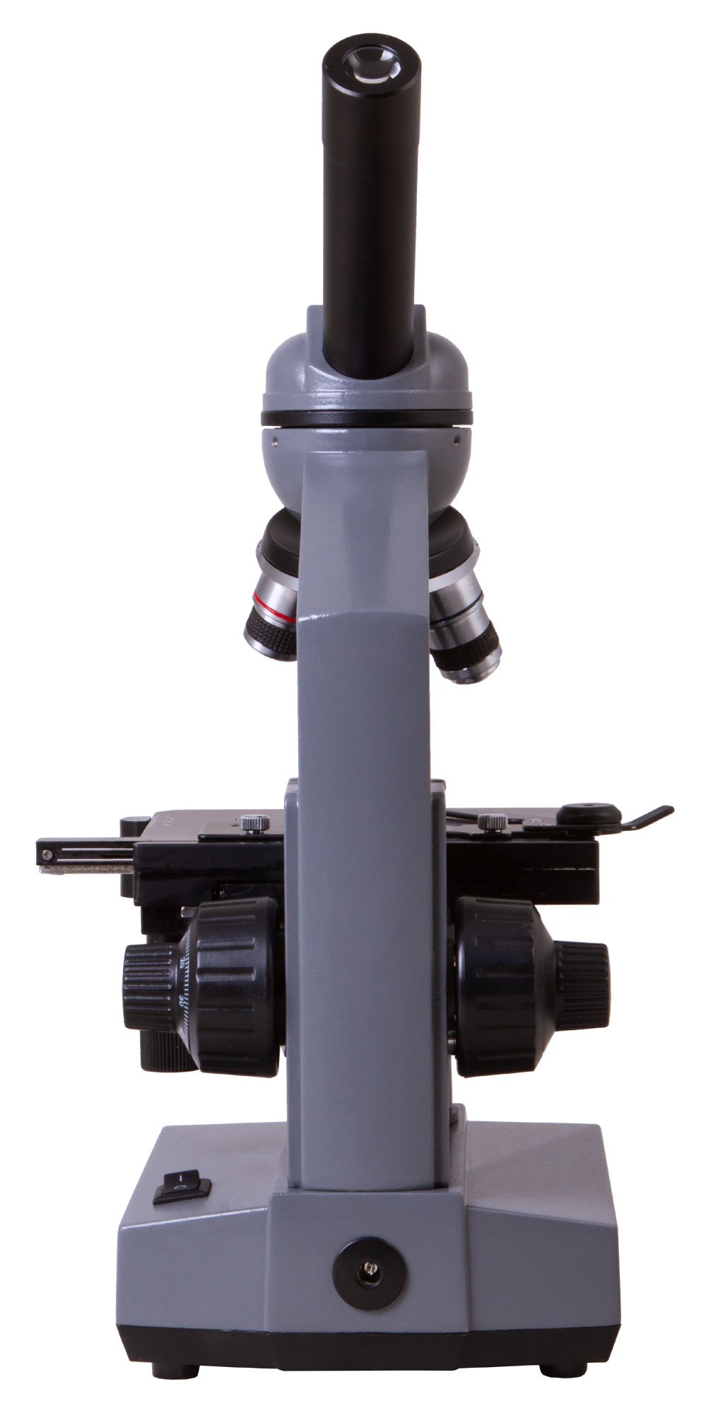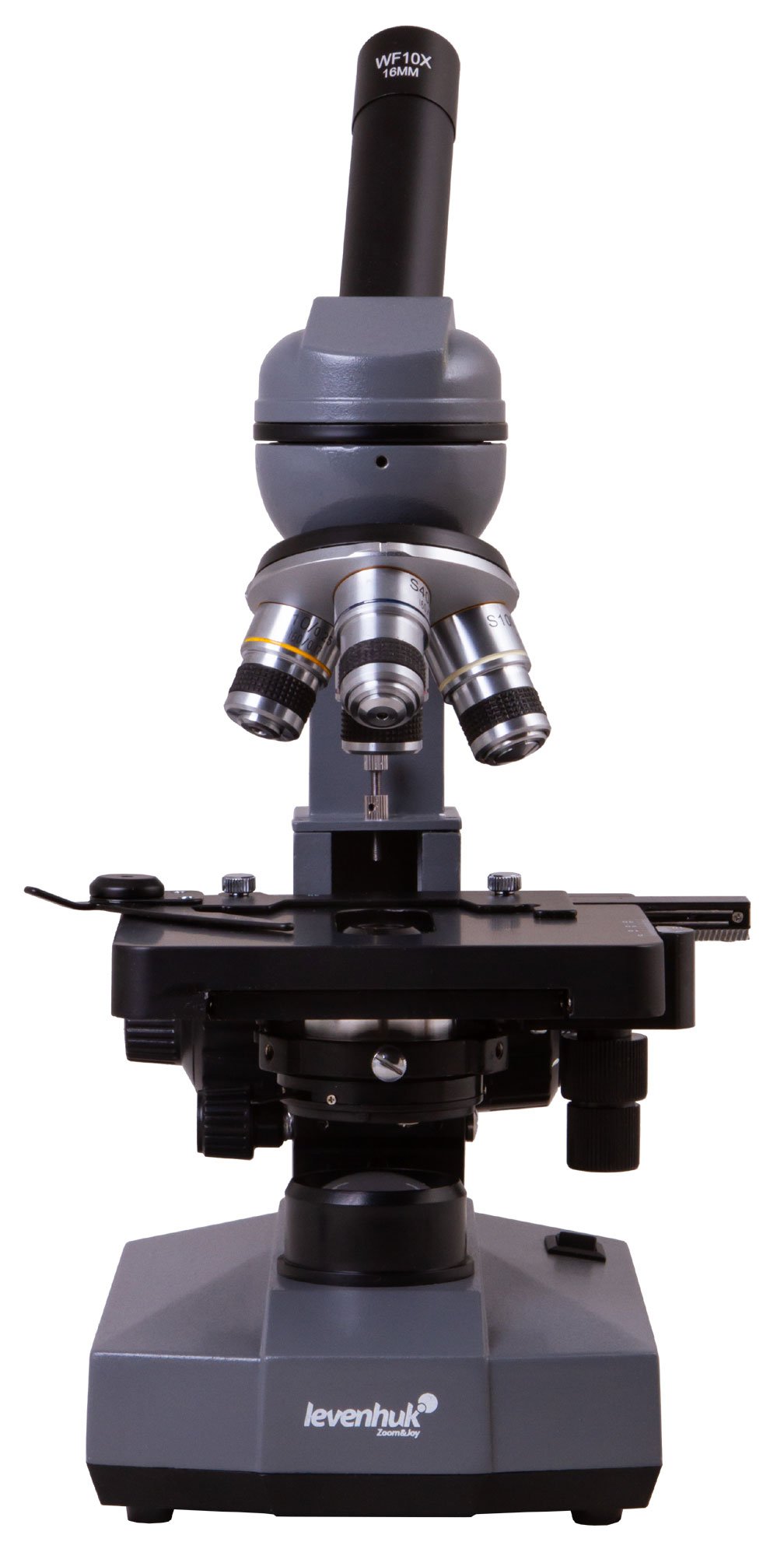 В микроскопе установлена монокулярная насадка, которая вращается на 360°. Угол наклона насадки – 30°. В револьверное устройство установлены 4 ахроматических объектива, которые передают четкое и контрастное изображение без искажений. При использовании 100-кратного объектива можно применять метод масляной иммерсии (флакон с маслом включен в комплект поставки). Увеличение микроскопа находится в диапазоне от 40 до 1600 крат.