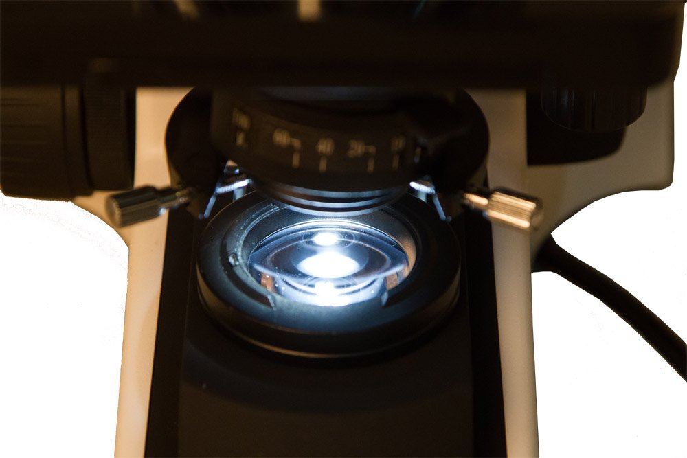 Осветительная система позволяет настраивать свет по методу Келера. Она состоит из нижнего светодиодного осветителя, конденсора Аббе с ирисовой диафрагмой и светофильтром. Яркость подсветки регулируется. Освещение по Келеру обеспечивает идеальное сочетание контрастности и разрешения и широко используется в профессиональных исследованиях. Все наблюдения в Levenhuk MED 1000B ведутся в проходящем свете по методу светлого поля, доступна и масляная иммерсия.