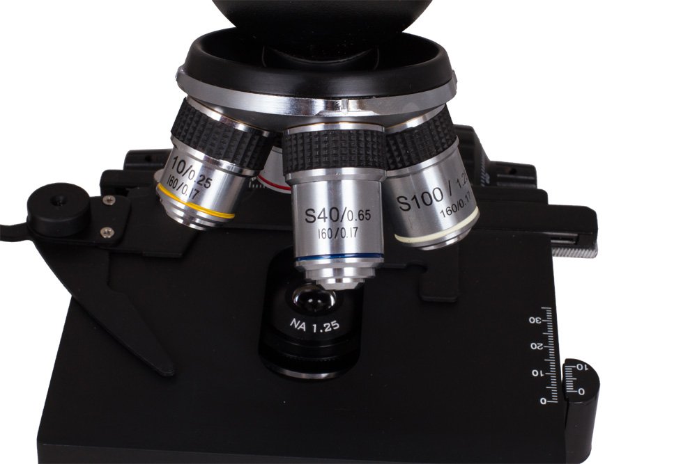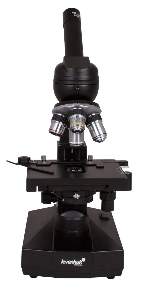 Прибор комплектуется четырьмя ахроматическими объективами (4х, 10х, 40х, 100х МИ) и двумя широкопольными окулярами (WF10х, WF16х). Помимо этого, в комплект входит цифровая камера Levenhuk C310, позволяющая передать увеличенное изображение изучаемого препарата на монитор компьютера. Для подключения к компьютеру используется USB-кабель. Камера совместима с MMac OS, Linux, Windows.