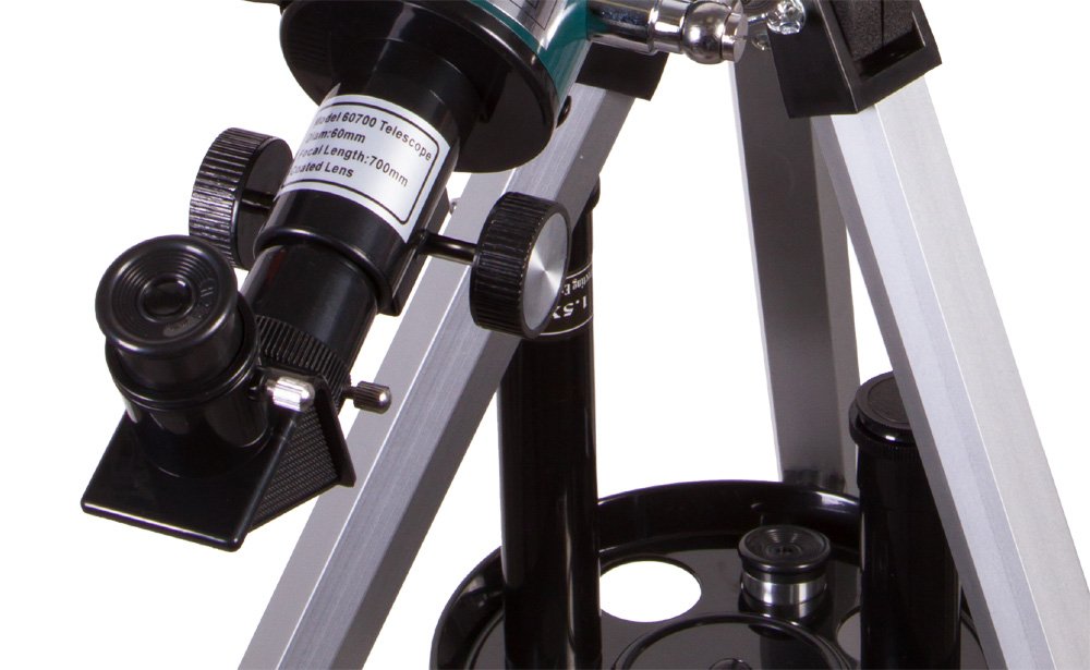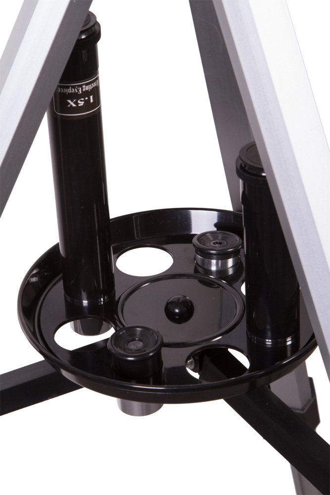 Вместе с телескопом вы получаете множество аксессуаров: окуляры разной кратности, линзу Барлоу 3х, диагональное зеркало, оборачивающий окуляр 1,5х. Во время наблюдений все аксессуары можно разместить на удобном лотке, который устанавливается на треногу. Тренога алюминиевая – легкая и устойчивая. Высота ее ножек регулируется.