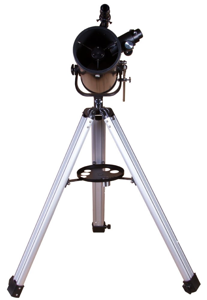 Оптическая труба установлена на классическую азимутальную монтировку. Ею легко управлять, на освоение требуется всего несколько минут. Монтировка, в свою очередь, устанавливается на алюминиевую треногу. Она устойчивая, надежная и регулируется по высоте. При необходимости на треногу можно установить лоток для аксессуаров, чтобы разместить на нем все необходимое для наблюдений. В комплект поставки включено два таких аксессуара – короткофокусный и длиннофокусный окуляры.