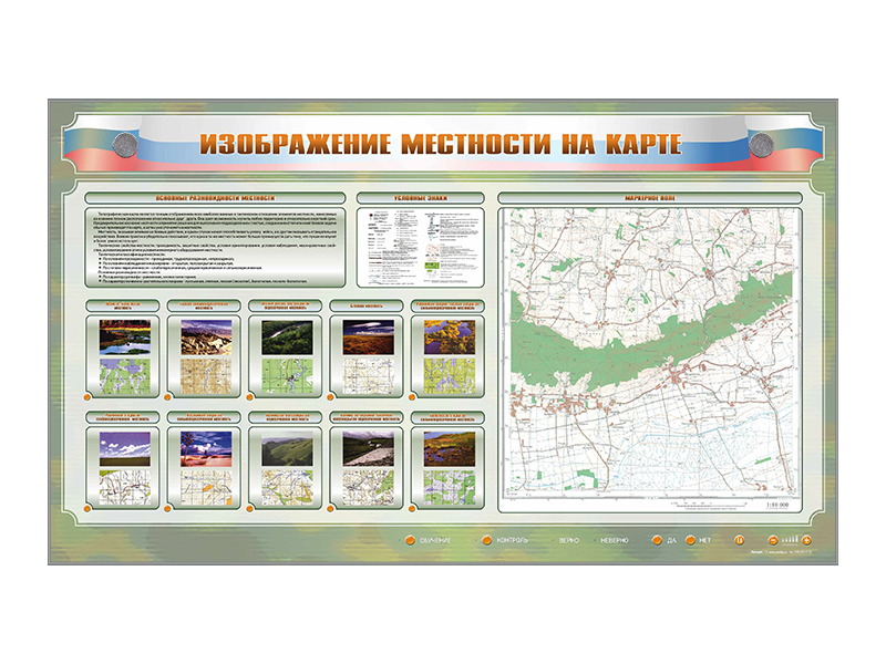 Интерактивный электрифицированный стенд представляет собой панель с раздельной секционной световой индикацией, на которой представлена информация о тактических свойствах местности и тактических классификациях местности. В конструкцию учебного оборудования интегрированы высокочувствительные сенсоры для управления стендом при помощи интерактивного воздействия приемо-передающих устройств. Предусмотрено два режима работы со стендом: "Обучение" и "Контроль".