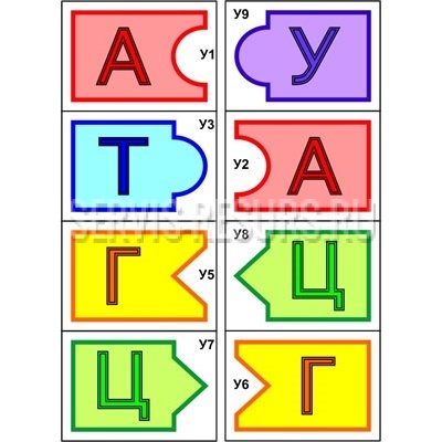 Пособие включает в себя 32 карточки (№ У1-У10). На карточках приведены обозначения азотистых оснований, три из которых: аденин (А), гуанин (Г) и цитозин (Ц) входят как в состав ДНК, так и в состав РНК, тимин (Т) встречается только в молекуле ДНК, а в молекуле РНК его заменяет урацил (У). Каждое азотистое основание приведено в двух вариантах: № У1, У3, У5, У7 предназначены для монтажа одной из цепи ДНК. Карточки № У2, У4, У6, У8 – для монтажа справа от нее второй цепи ДНК, согласно принципу копллементарности. Заменив карточки У8 на У9 можно собрать цепь РНК и продемонстрировать процесс транскрипции. Карточка № У10 предлагается ученикам при выполнении задания, описанного в пятом пункте схемы 1. (Это усложняет задание: если ученик, которому было задано смонтировать вторую цепь ДНК на правой стороне доски использовал данную карточку, учитель указывает ему на ошибку: урацил не может входить в состав молекулы ДНК).