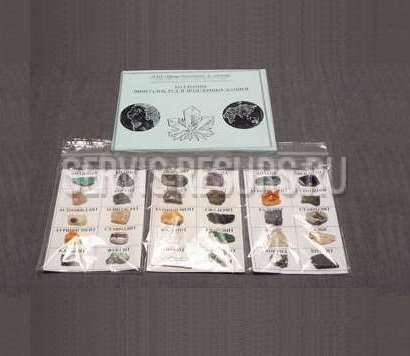 На каждой планшетке, форматом 120х90мм, наклеены по 10 шт. различных минералов, представляющих собой горные породы, рудные минералы, поделочные камни. Под каждым образцом имеется его название. На оборотной стороне планшетки обозначены места добычи каждого минерала. Каждая планшетка уложена в полиэтиленовый пакет с замком. Планшетки уложены в упаковочную коробку. При самостоятельных работах учащимся можно раздать на парты планшеты и предложить отметить характерные особенности одного или двух – трёх известных образцов, написать об их значении и применении.