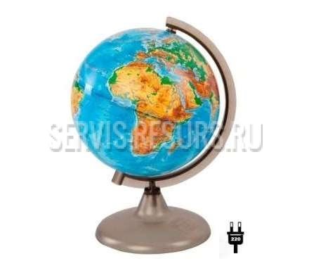 Глобус физический дает возможность продемонстрировать расположение на поверхности земного шара материков, океанов, морей, островов, рек, горных вершин, наиболее крупных городов и др. Условная раскраска карты демонстрирует рельеф суши и дна океанов. Внутри глобуса установлена лампа для подсветки.