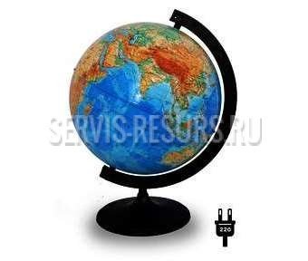 Глобус физический дает возможность продемонстрировать расположение на поверхности земного шара материков, океанов, морей, островов, рек, горных вершин, наиболее крупных городов и др. Условная раскраска карты демонстрирует рельеф суши и дна океанов. Внутри глобуса установлена лампа для подсветки.