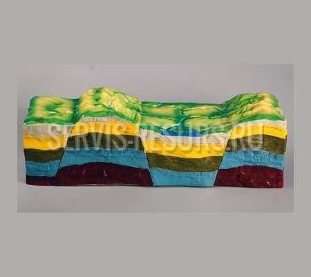 В комплект входят 2 модели, изготовленные из пластмассы и раскрашенные. Одна модель изображает участок земной коры с рельефом, образованным в результате тектонического процесса сбросо-сдвигов. Другая модель состоит из отдельных блоков (4шт.), позволяющих показать, как происходит в природе процесс сбросо-сдвигов.