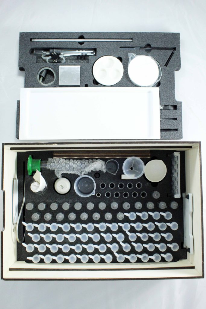 1 Флакон 10 мл. 76 шт., 2 Пробка со шпателем 15 шт., 3 Крышка-капельница 54 шт., 4 Пробка резиновая глухая, для флаконов 7 шт., 5 Пробка с держателем 1 шт., 6 Стакан стеклянный 50 мл. 1 шт., 7 Стакан пластиковый 100 мл. 1 шт., 8 Спиртовка 1 шт., 9 Цилиндр мерный 50 мл., пластиковое основание 1 шт., 10 Палочка стеклянная 1 шт., 11 Пробирка 10 шт., 12 Подставка под сухое горючее 1 шт., 13 Сухое горючее 1 шт., 14 Ступка №1 1 шт., 15 Пест №1 1 шт., 16 Выпарительная чаша №1 1 шт., 17 Планшетка с ячейками 1 шт., 18 Предметное стекло 1 шт., 19 Фоновый экран 1 шт., 20 Пробка со стеклянной газоотводной трубкой 1 шт., 21 Пробка с силиконизированной газоотводной трубкой 1 шт., 22 Зажим пробирочный 1 шт., 23 Выпарительная пластина 1 шт., 24 Пинцет 1 шт., 25 Основание штатива 1 шт., 26 Стойка штатива 2 шт., 27 Втулка резьбовая, соединительная 1 шт., 28 Муфта 1 шт., 29 Лапка штатива 1 шт., 30 Кольцо штатива малое 1 шт., 31 Фильтры обеззоленные 100 шт., 32 Спираль медная/петля нихромовая 1 шт., 33 Периодическая система химических элементов Д.И Менделеева 1 шт., 34 Таблица растворимости 1 шт., 35 Наконечник стеклянный 1 шт., 36 Комплект этикеток 1 шт., 37 Карандаш 1 шт., 38 Трафарет 1 шт., 39 Спичечный коробок 1 шт., 40 Пробка № 12,5 1 шт., 41 Воронка лабораторная 1 шт., 42 Прибор для получения газов лабораторный 1 шт., 43 Лоток 1 шт.