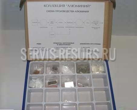 В коллекции представлены натуральные образы руд для производства алюминия, продукты технологической переработки руд, а также образцы алюминия, его сплавов и изделий. Образцы занумерованы в соответствии со списком и уложены в ложементы картонной коробки. Коробка с маркировкой упакована в термоусадочную прозрачную пленку.