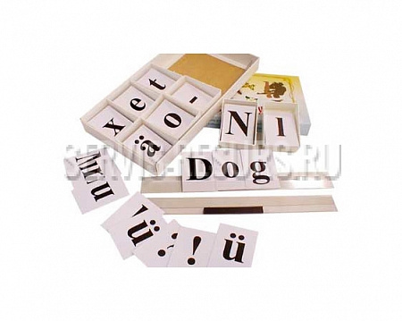 Пособие состоит из карточек с буквами латинского алфавита и карточек со знаками препинания. На каждую букву приходится по 10 карточек (5 на заглавные буквы, 5 – на строчные). Кроме того, в комплект входят буквы, используемые в немецком языке, в количестве 20штук – по 5 каждой. Комплект уложен в ячейки картонной коробки. Для размещения литер набор укомплектован планшетами с планками-пазами.