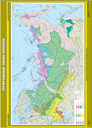 Фоновая окраска карты дана по природным зонам: арктические пустыни, тундра, лесотундра, тайга, смешанные леса, широколиственные леса, муссонные смешанные леса, области высотной поясности.