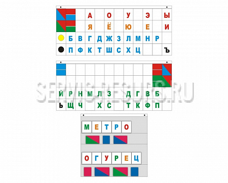 Пособие состоит из 72 карточек с буквами размером 55*90мм, расположенных в полиэтиленовой кассе, и наборного полотна.