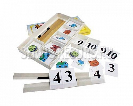 В комплект пособия входят карточки с картинками, цифрами, математическими знаками, размером 70х95мм, отпечатанные типографским способом на плотном картоне, заламинированные – всего 150шт. Перед использованием пособия необходимо наклеить магнитную резину на карточки, чтобы можно было прикреплять их на доску. Поскольку, каждое изображение выполнено в двух цветах, пособие можно использовать и для обучения навыкам распознавания цвета. Карточки уложены в ячейки складной картонной коробки и упакованы в прозрачную термоусадочную пленку.
