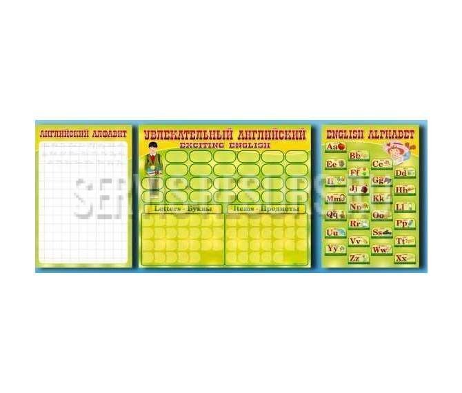 Тематическая магнитная доска "Увлекательный английский" представляет собой информационную панель, на которой расположены буквы английского алфавита.
