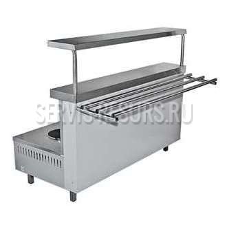 Мармит первых блюд предназначен для временного поддержания в горячем виде супов, бульонов, каш. Расположенная на высоте тележек полка с конфорками позволяет легко перемещать тяжелую наплитную посуду для хранения на мармит. Над мармитом расположена двухярусная полка, на которой размещаются порционные блюда.
