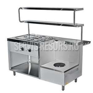 Мармит универсальный первых и вторых блюд предназначен для демонстрации, кратковременного хранения и раздачи посетителям супов, бульонов, каш, а также вторых блюд и соусов в горячем состоянии. Над мармитом расположена двухярусная полка, на которой размещаются порционные блюда. Мармит комплектуется гастроемкостями GN-1/1, GN-1/2, GN-1/4.