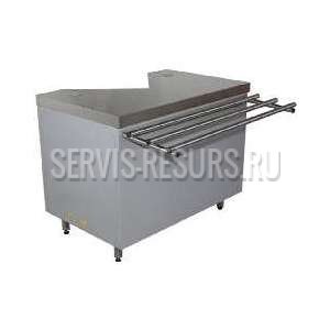 Столешница и полки - нерж. сталь AISI 304, боковые и передние панели - крашеная оцинковка (серый цвет). Внизу предусмотрена дополнительная полка. В столешнице находятся отверстия с заглушками для вывода проводов кассового оборудования. Направляющая входит в комплект поставки.