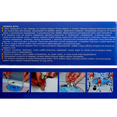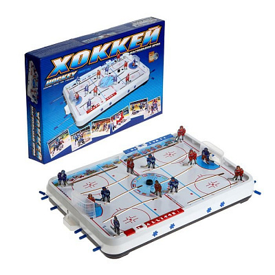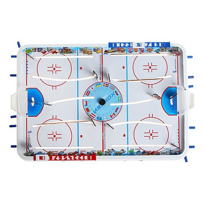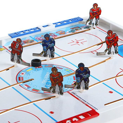 За каждого игрока выступает 6 хоккеистов: центральный, левый и правый нападающие, вратарь, 2 защитника. Все члены команды перемещаются с помощью металлических стержней и могут крутиться на 360°. По краям игрового поля расположены два пластиковых мини-табло, чтобы не забыть счёт матча.