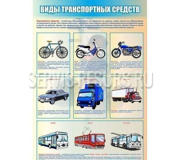 Стенд "Виды транспортных средств" представляет собой панель с яркой иллюстрацией, на которой размещена информация о видах и типах транспорта.