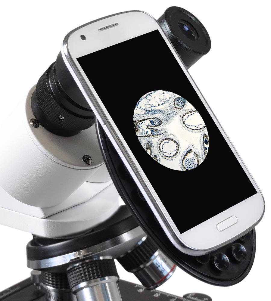 Еще одна особенность микроскопа – адаптер для смартфона, входящий в комплект поставки. С его помощью на окулярной трубке можно фиксировать мобильное устройство и использовать его камеру для фотографирования своих наблюдений.
