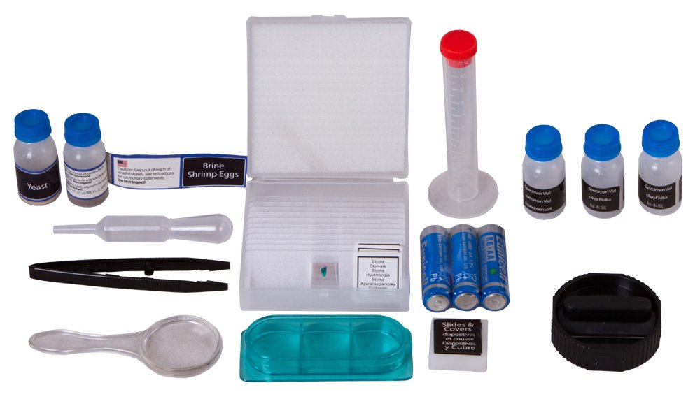В набор для опытов, который идет в комплекте, включены готовые микропрепараты, покровные и предметные стекла, инструменты для работы с образцами, флаконы с препаратами и инкубатор для артемии. Этого «арсенала» юному ученому хватит на множество часов увлекательной работы с микроскопом.