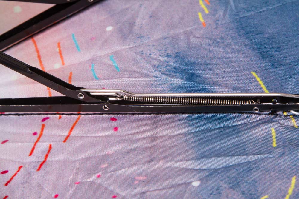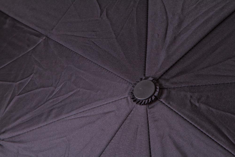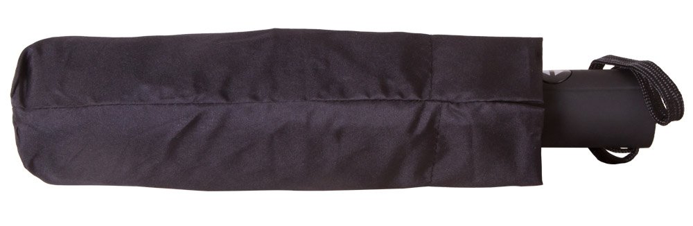 Купол зонта сделан из специальной ткани эпонж. Она отталкивает воду, поэтому капли дождя просто скатываются с зонта на землю. Каркас и спицы изготовлены из прочной стали, ручка – из пластика. Все элементы конструкции окрашены в черный цвет. В комплект поставки входит чехол.