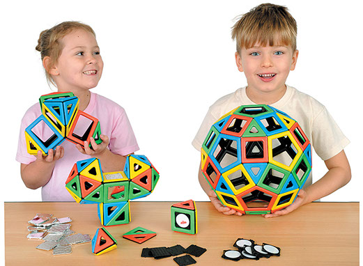 36 квадратов, 60 равносторонних треугольников, 24 прямоугольных треугольника, 12 прямоугольников, 12 пятиугольников, 20 зеркальных панелей, 20 панелей на которых можно писать,